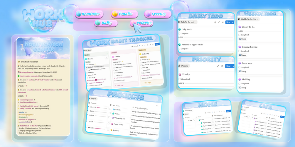 - Task completion stats â Work tasks (with %), Home & Life tasks (with %), all with live progress bars