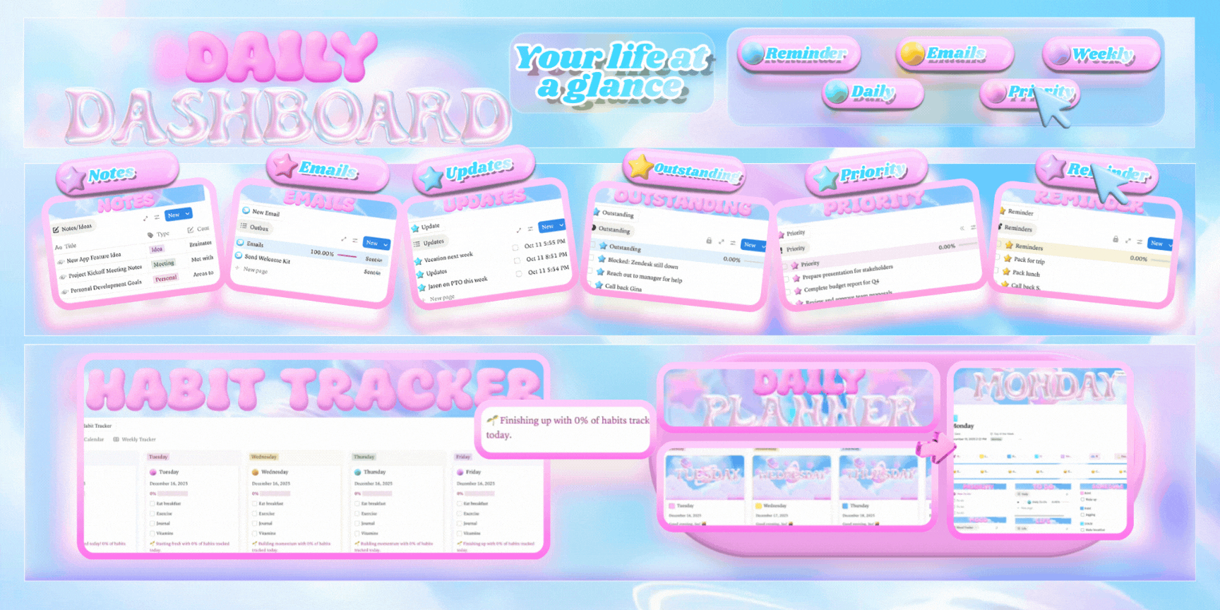 â¨One-tap resets meet you with a fresh start instead of shame. Habit Tracker covers Monday through Sunday with progress bars and encouraging messages. The single-scroll Daily Dashboard keeps everything in one gentle sweepâpriorities, notes, projects, mood menu, and quick capture right under your thumb.