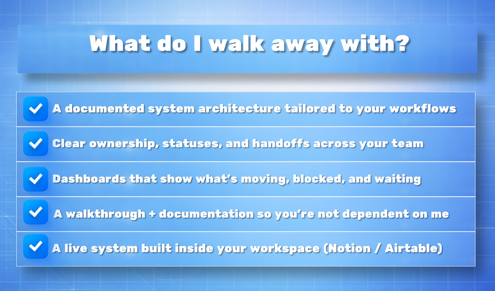 This is not a template or downloadable product. Each system is built for a specific team and set of workflows. Larger or more complex builds may require a separate scope.